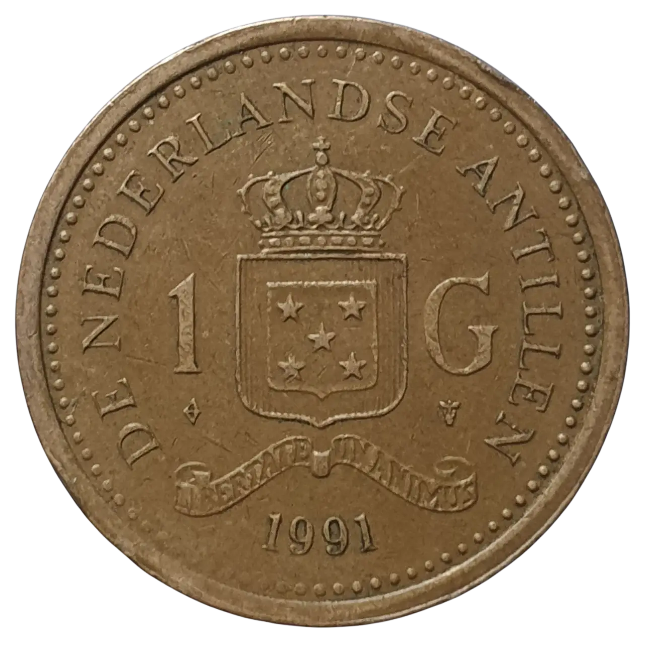Antilhas Holandesas,1 gulden 1991, aço revestido de bronze, 6 g, 24 mm, km# 37, rainha Beatriz