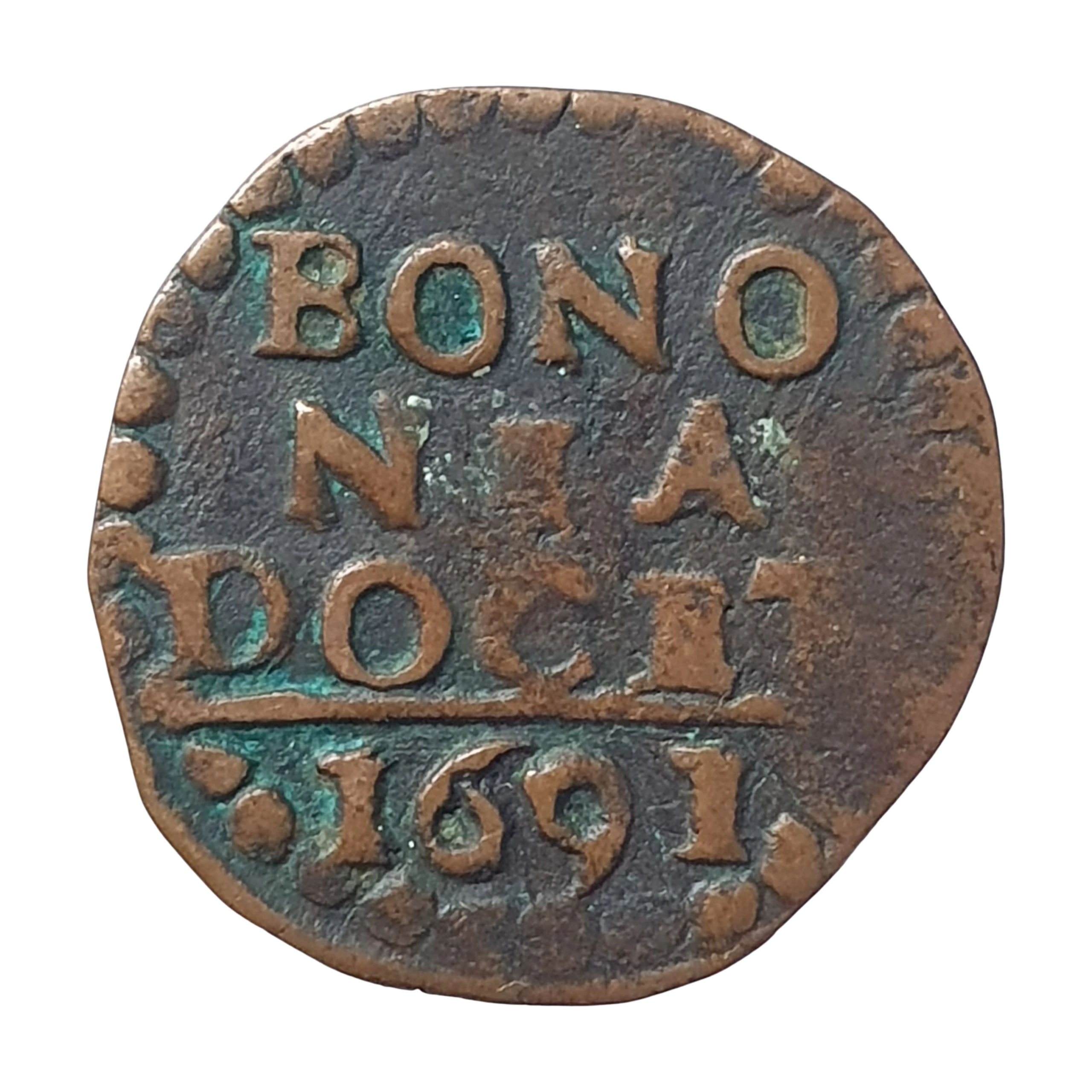 Bolonha (estados papais), 1 quatrino, 1691, cobre, 2.4 g, 20 mm, km# 114, papa Inocêncio XII