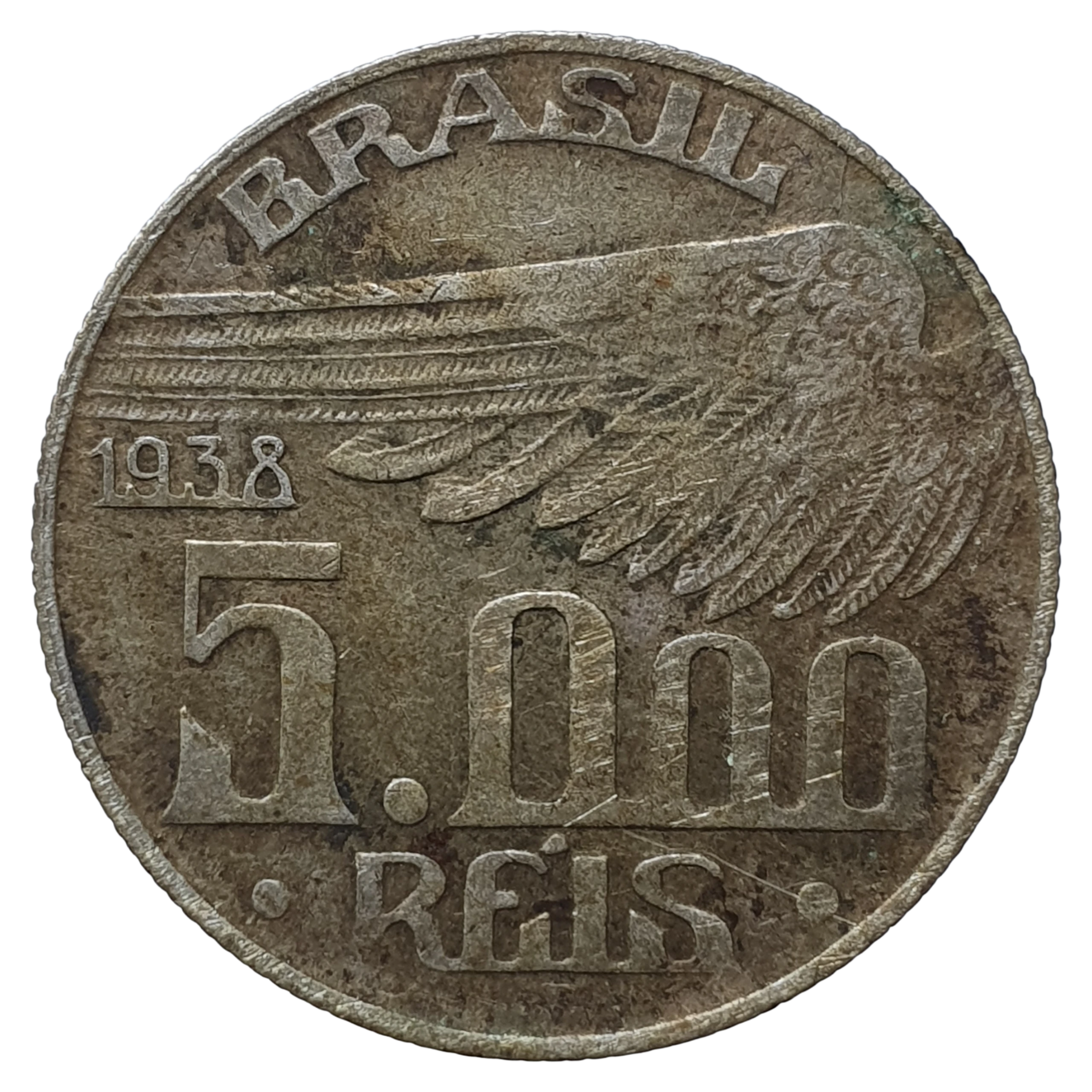 Brasil, República, 5000 réis 1938, prata 0.600, 10 g, 27.5 mm, Santos Dumont, km# 543