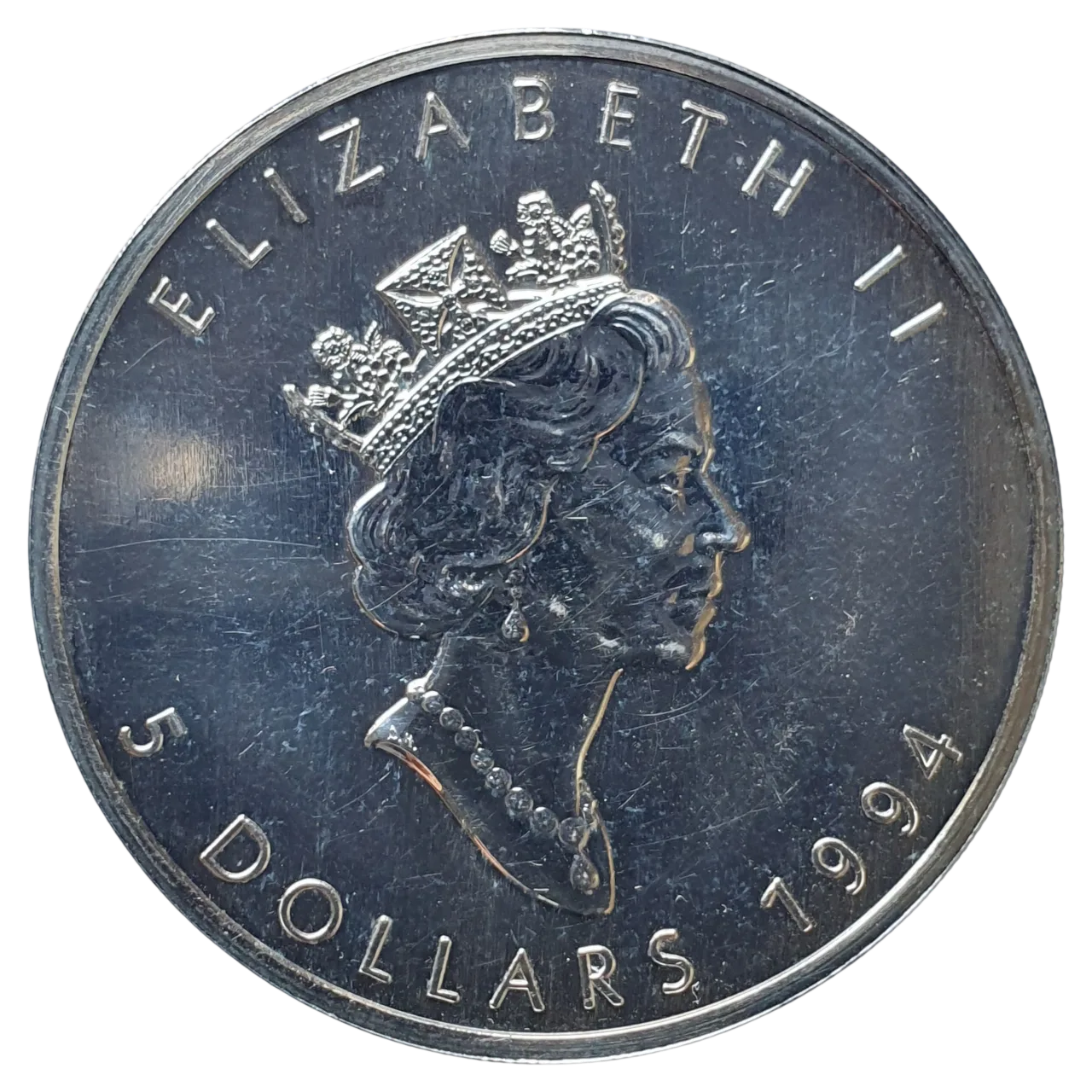 Canadá, 5 dólares 1994, prata 0.9999, 31.1 g, 38 mm, Maple Leaf
