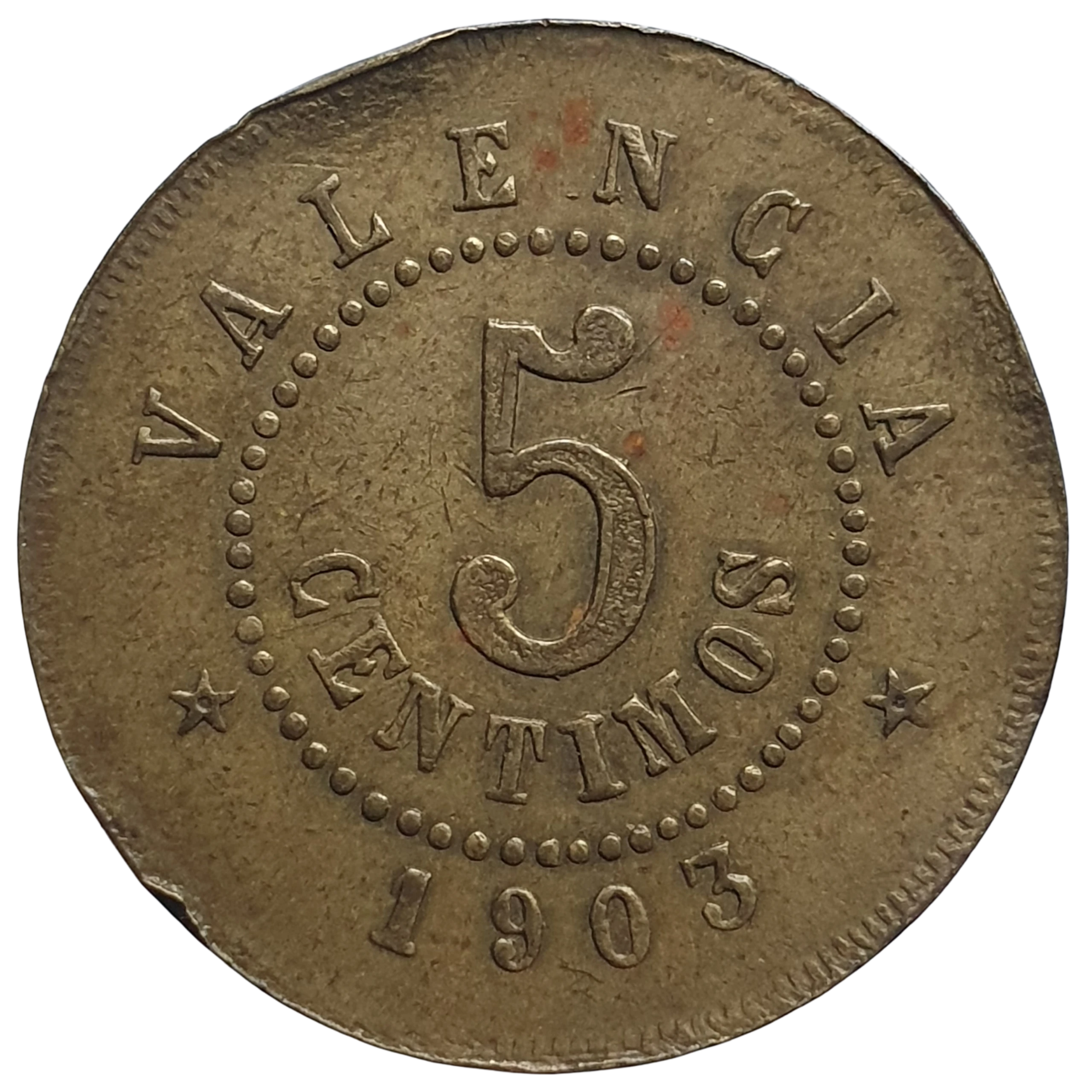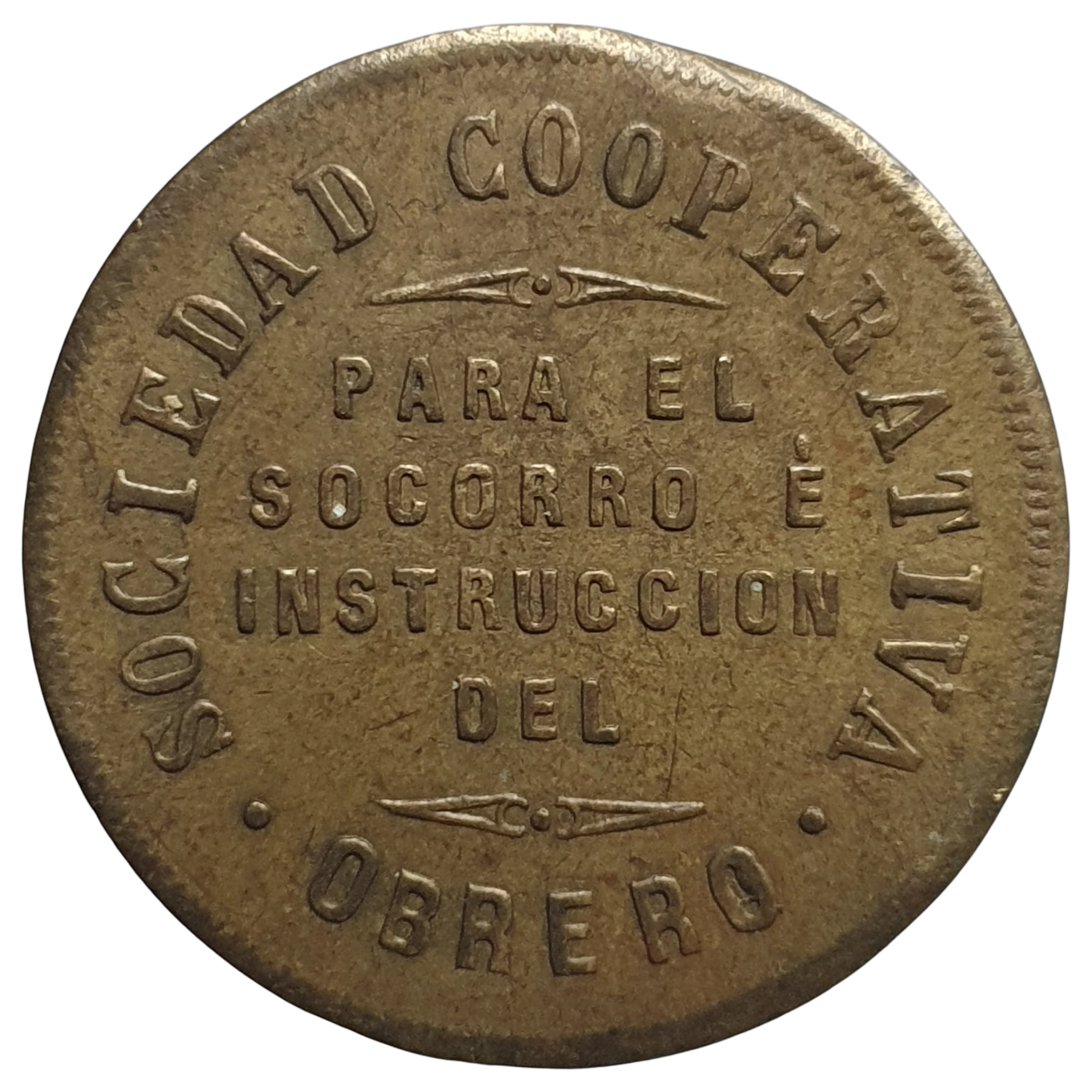 Espanha, Valência, 5 centavos, latão (?), 1903, 6.3 g, 30 mm, Sociedade Cooperativa de Auxílio e Instrução do Trabalhador