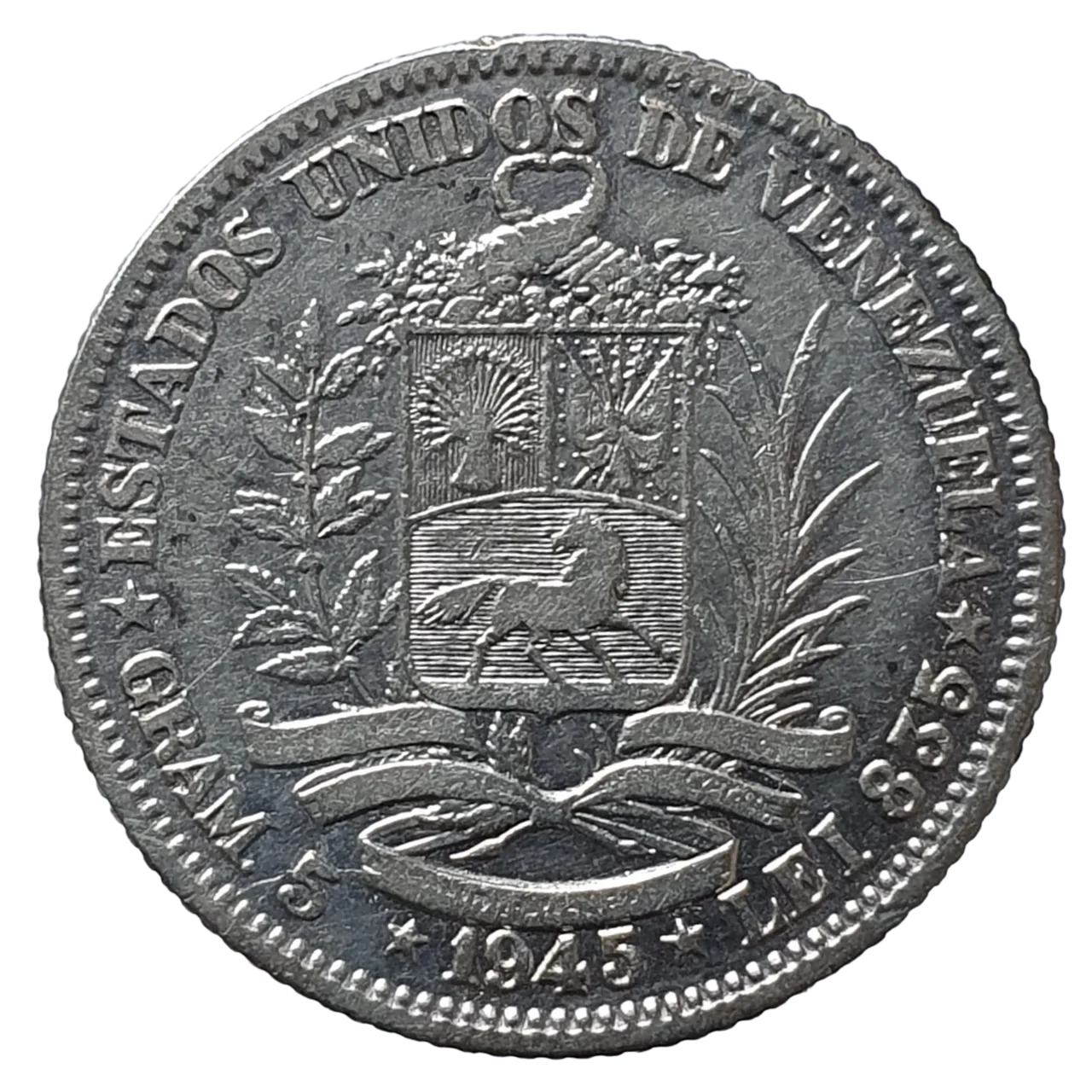 Venezuela, 1 bolivar 1945, prata 0.835, 5 g, 22.8 mm, Y# 22a